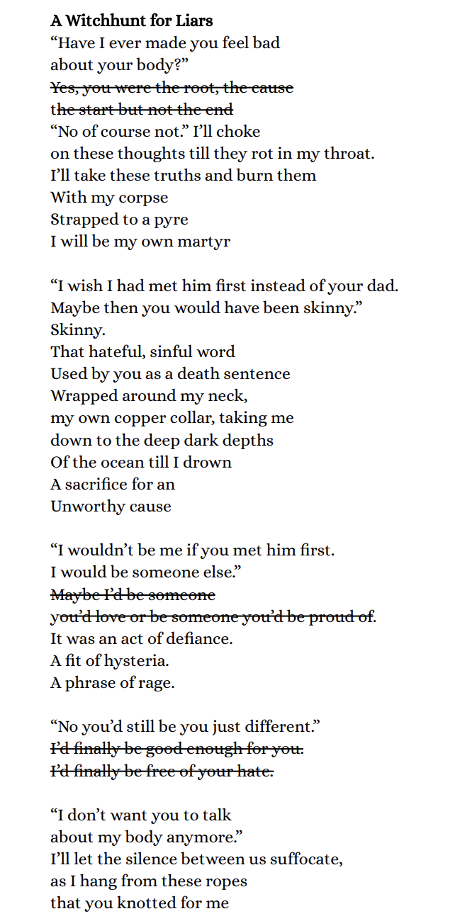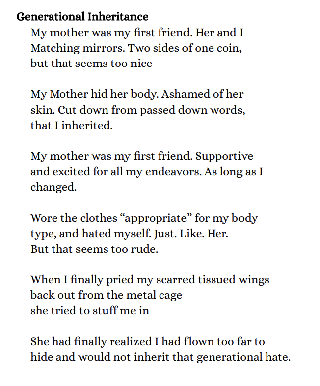 Bio: Caitlyn Fortner is a senior in the Creative Writing department, currently working on a rather lengthy gothic vampire novel. When she's not writing her book you can find her reading, writing for the school newspaper the Reporter as a Variety Writer (she just started recently) or hanging out with her cat and boyfriend at home playing video games, board games, or Magic the Gathering, she maybe playing a vampire precon but she doesn't want to talk about that.